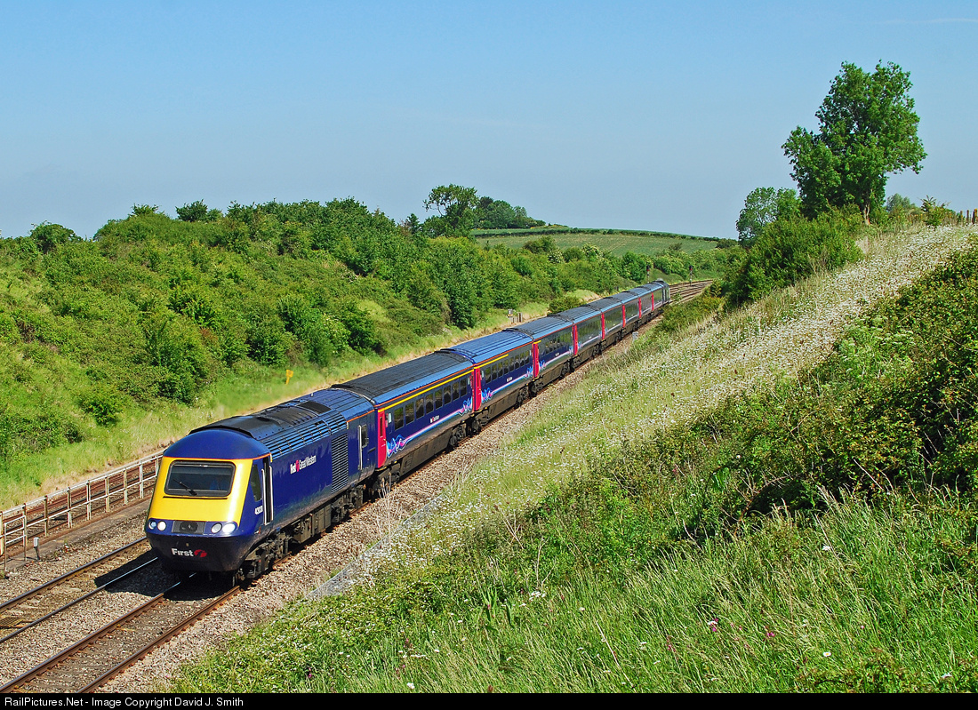 After almost 40 years of service,the days of the High Speed Trains on the former Western Region are now numbered.Within a few years,electrification will bring brand new stock,and these reliable workhorses will be sent elsewhere.Power car 43031 was introduced in September 1976,and since then has spent its entire life working services in and out of London.Here,it heads a Cheltenham to London Paddington service,and has just taken the Stroud Valley branch at Standish Junction,a few miles beyond Gloucester.