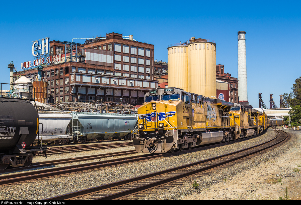 | In the San Francisco Bay Area along Carquinez straits, Union Pacific 5257 leads auto racks around the curve at the iconic C@H sugar refinery. Since 1906 the sugar refinery has been processing sugar cane from Hawaii. |