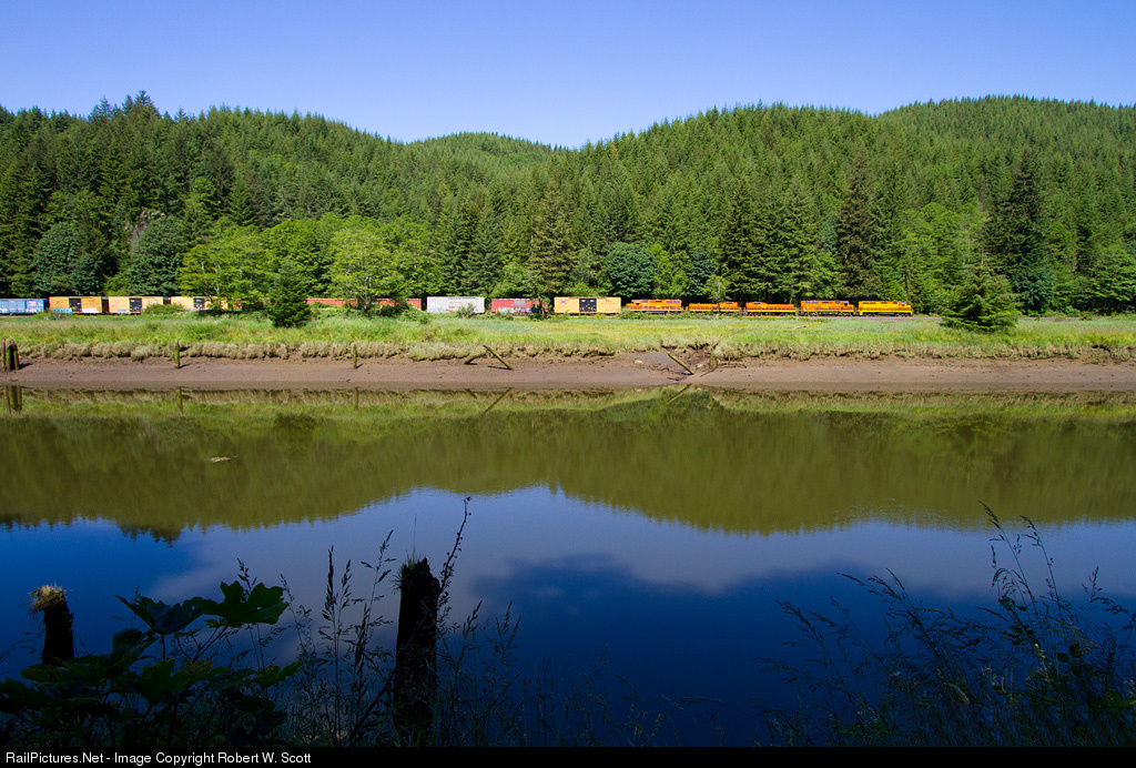 An AABBA set is led by ex-Rock Island GP40 on the Toledo Hauler along the Yaquina River as it heads east after leaving Toledo, Ore. with 46 cars for Albany, Ore.