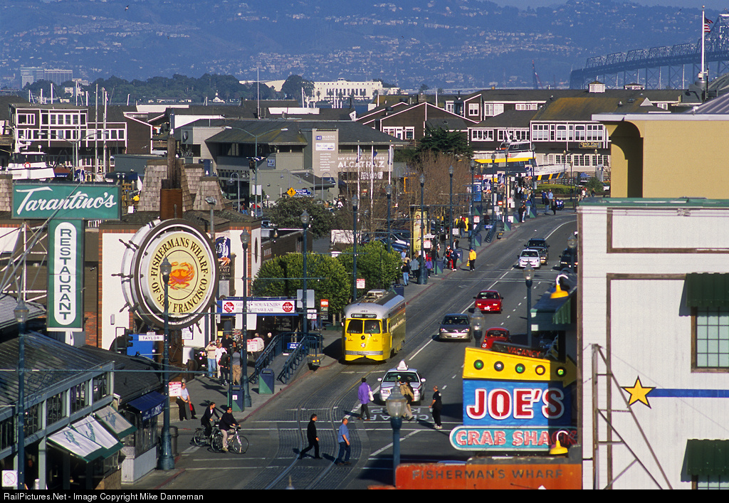 Passing all the local landmarks, a PCC streetcar approaches the Taylor Street stop on Jones Street at Fisherman’s Wharf in San Francisco, California, on the afternoon of March 6, 2003. The yellow and gray (appears white) scheme on car No. 1063 honors Baltimore Transit Company.