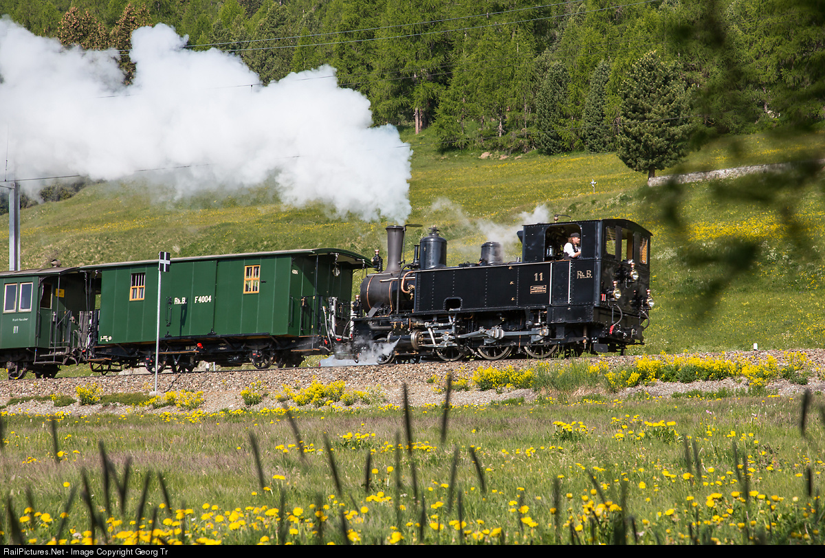 Steamlocomotive G 3/4 (2-6-0) # 11 "Heidi", built in 1902 by SLM, with a test train from Samedan to Zernez, near Bever. The locomotive was completely refurbished over years by members of association "Club 1889", got a new all welded boiler with superheater and was converted to burn light oil (diesel) instead of coal, to prevent lineside fires.