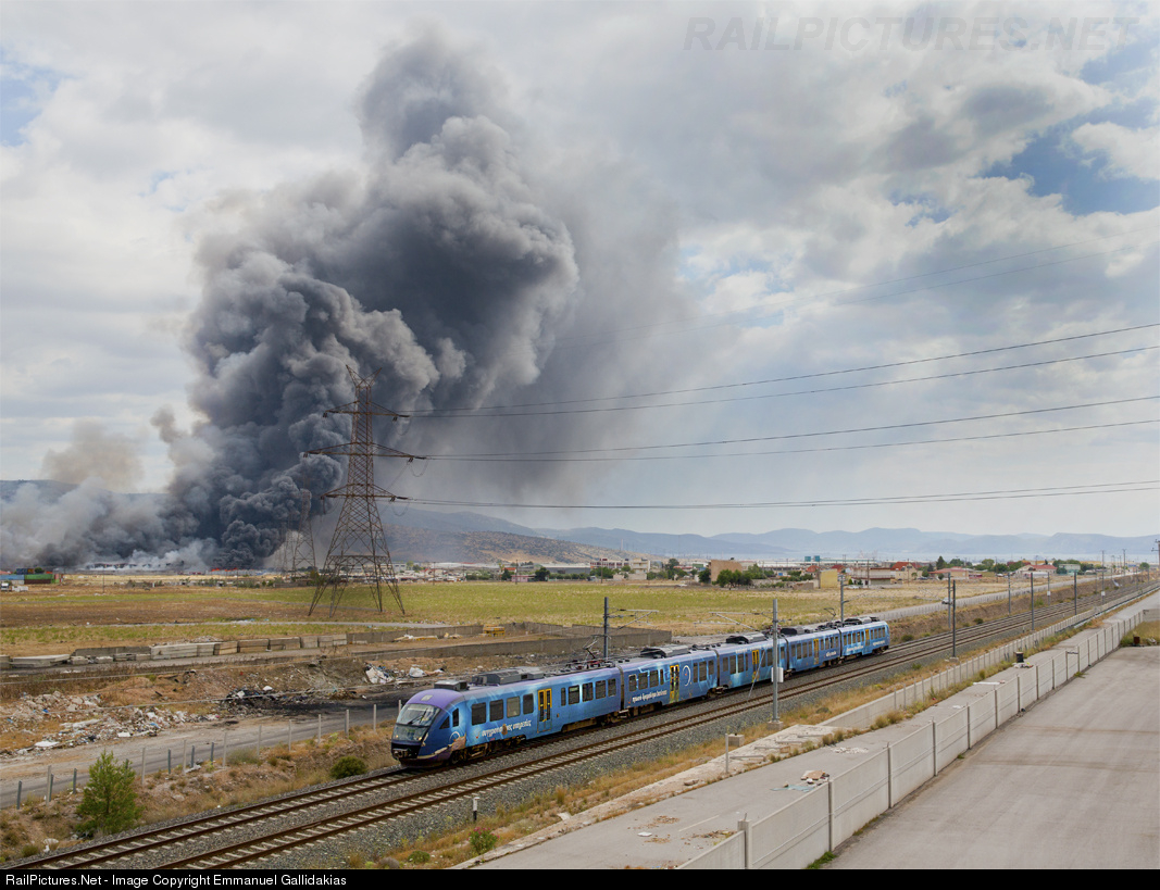 Siemens Desiro EMU on local train Kiato-Athens intl Airport passes from Aspropirghos area with the smoke from the burning facilities of a recycling factory in the background.