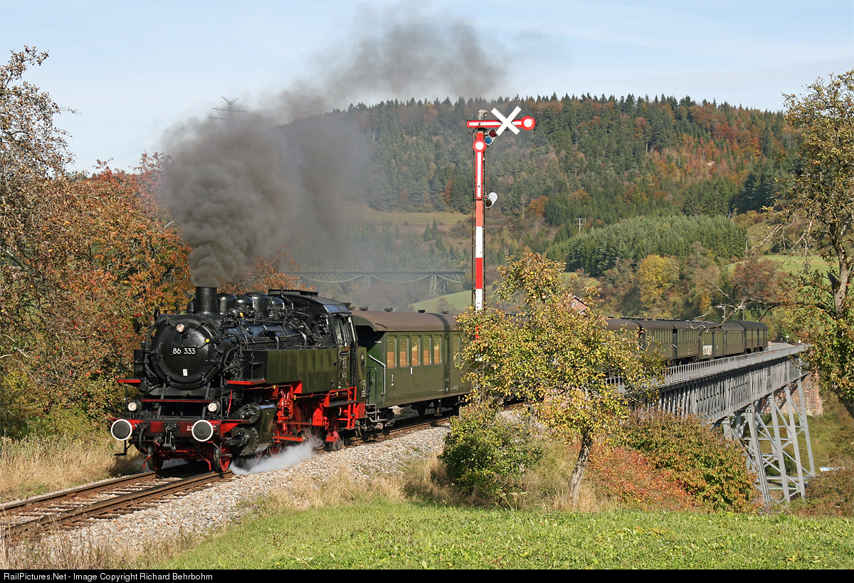 | On the Sauschwänzlebahn 86 333 is crossing the brigde "Talübergang Epfenhofen", behind there is the "Biesenbachviadukt".