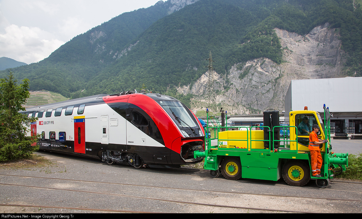 The brand new double deck long distance train ("FV-Dosto") for the SBB, RABe 502, in the Bombardier works Villeneuve, pulled by road/rail Eurotract E2000 vehicle. Bombardier calls this 200 meter long 8 car trains for 200 km/h TWINDEXX Swiss Express. The aluminium body shells are built in Görlitz/Germany, the bogies come from Siegen/Germany, electric equipment from Västeras/Sweden, assembling of the intermediate cars and commissioning of the whole train is made in Villeneuve/Switzerland. This is the powered (two axles) first class end car At 94 85 1 502 204-4. The whole train has about 7500 kW, weighs about 450 tons and has 700 seats. The SBB gets 30 of this IR200, 23 of the IC200 version (with dining car and baggage compartment) and 9 shorter IR100 (4 cars).