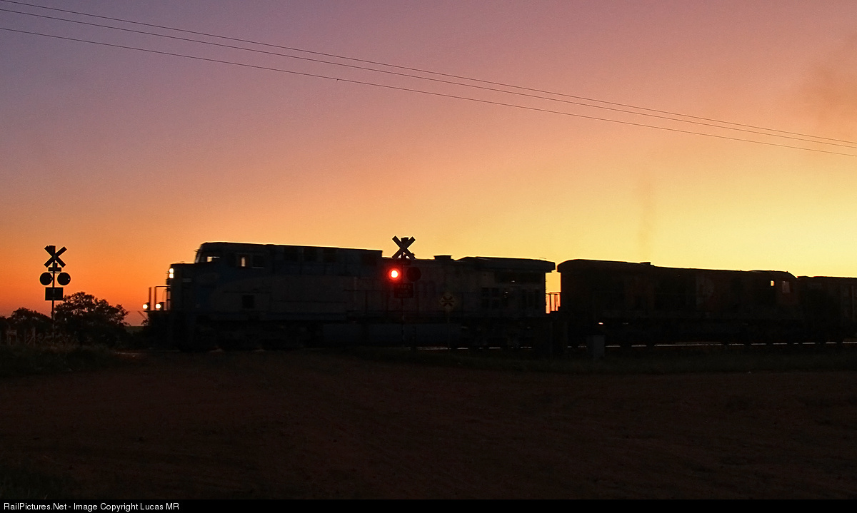 | The crossing lights flashes in a beautiful sunset at city of Ibaté, as southbound loaded X68 races along km 219 at track speed, from Araraquara to São Carlos. |