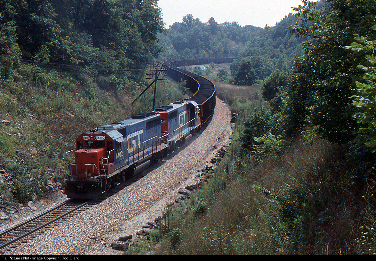 6402 GP40 and 6410 GP40-2 push hard on the Worthville turn to get the train up grade. See Photo ID 53001 to see the head end power.
