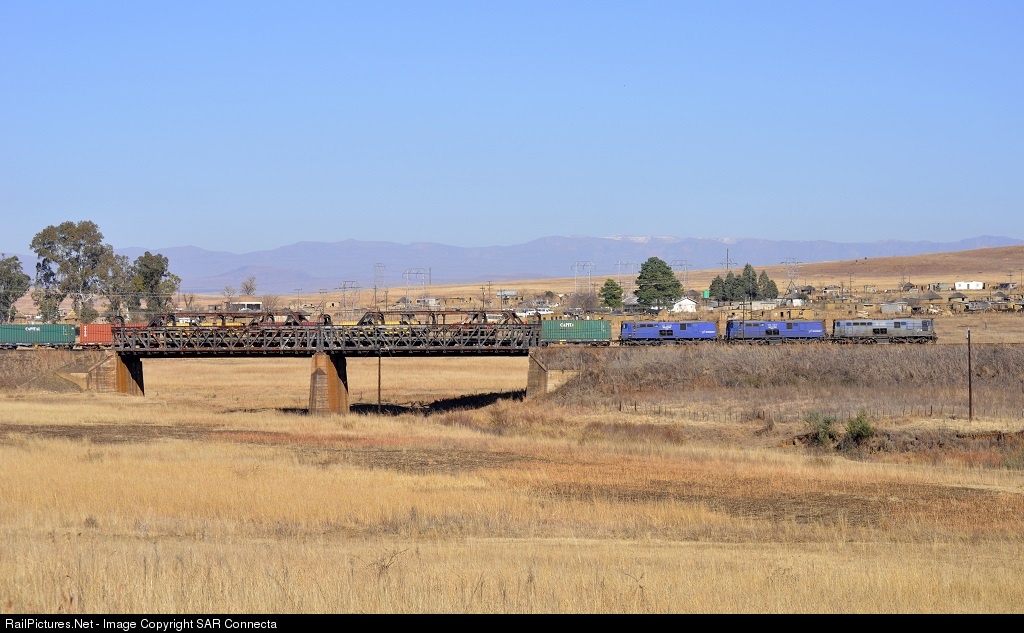 | This container train, with 18-052 in charge, is busy crossing the steel bridge out of Frere Station just before the Winston Churchill Capture Site (captured while on a train during the Anglo-Boer War in 1899). The train is starting the climb up towards Chieveley and further on Colenso. |