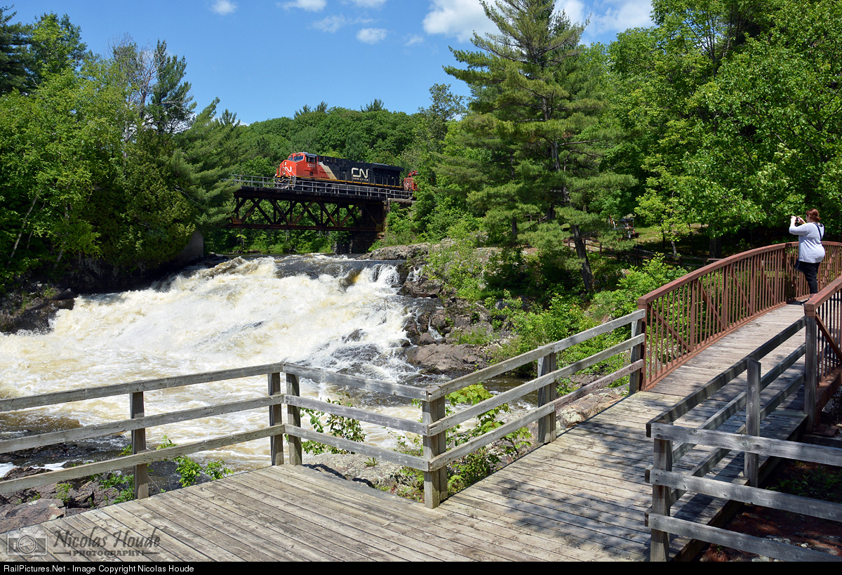 On a gorgeous afternoon, CN 461 has 57 cars as it goes over the Sainte-Ursule falls. At right a photographer snaps a picture as well.