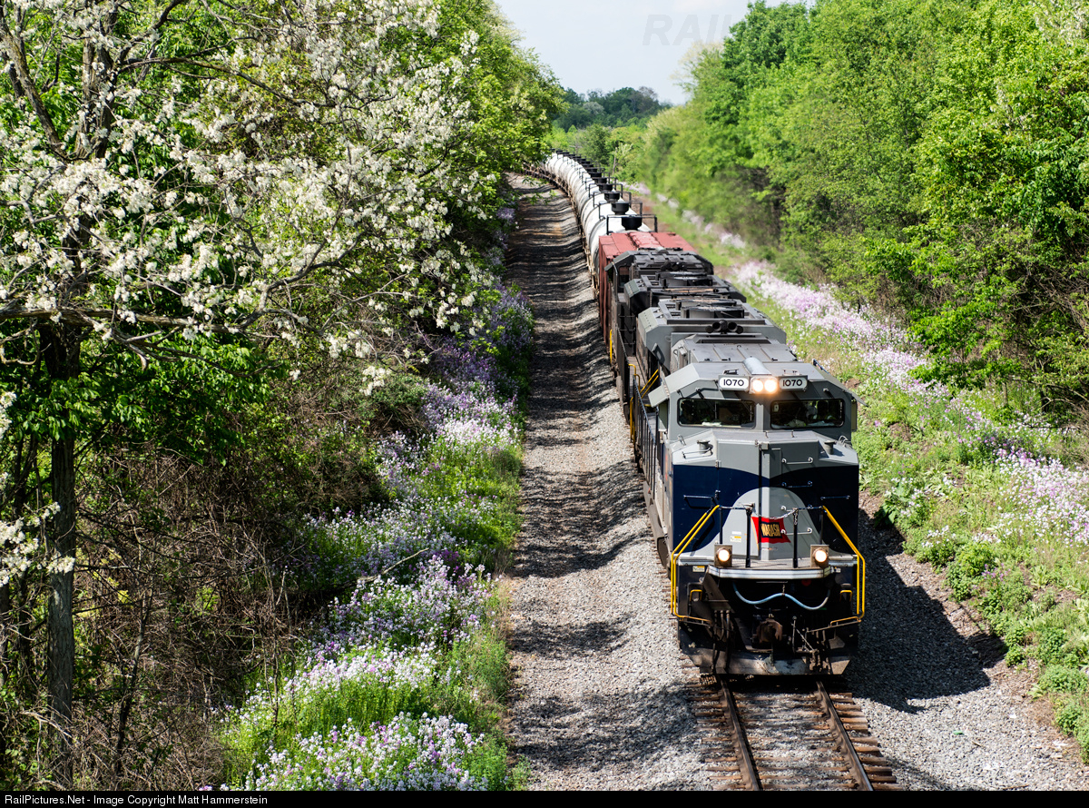 Spring flowers are in full bloom as NS 1070, the Wabash heritage locomotive, leads loaded oil train 64Z east on the Bayard Secondary.