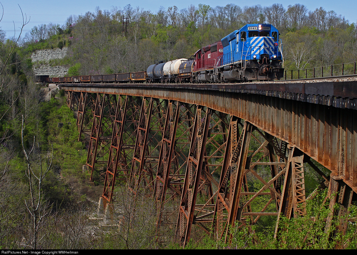 | A pair of leased EMD's roll J767 across the impressive trestle at Independence, KY, along the former L&N "Short Line." |