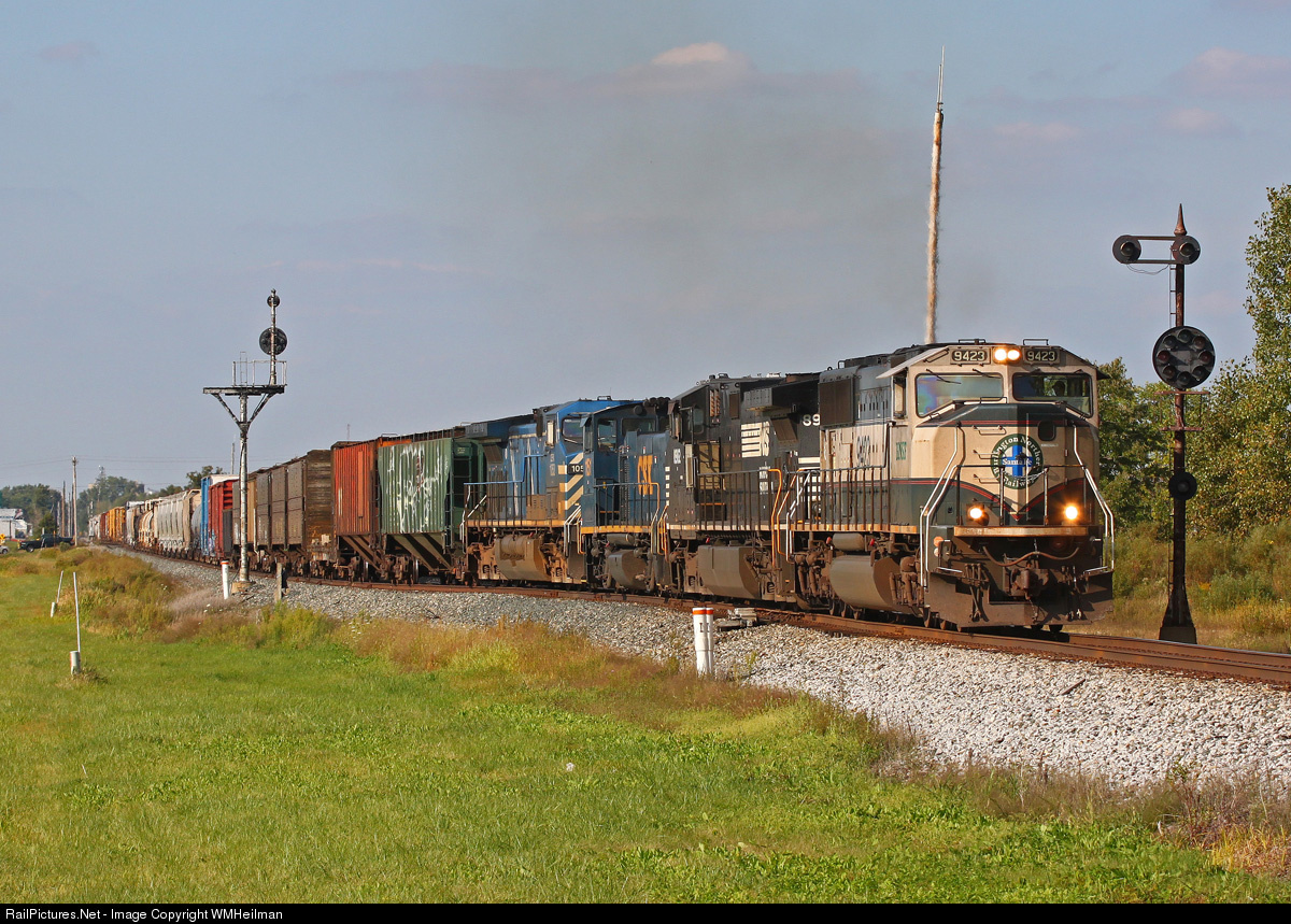 Southbound Q339 pulls out of the siding at South Ottawa behind an oddball lashup consisting of a former Burlington Northern SD70MAC, a NS Dash 9, a CSX MP15DC, and a CEFX AC44.