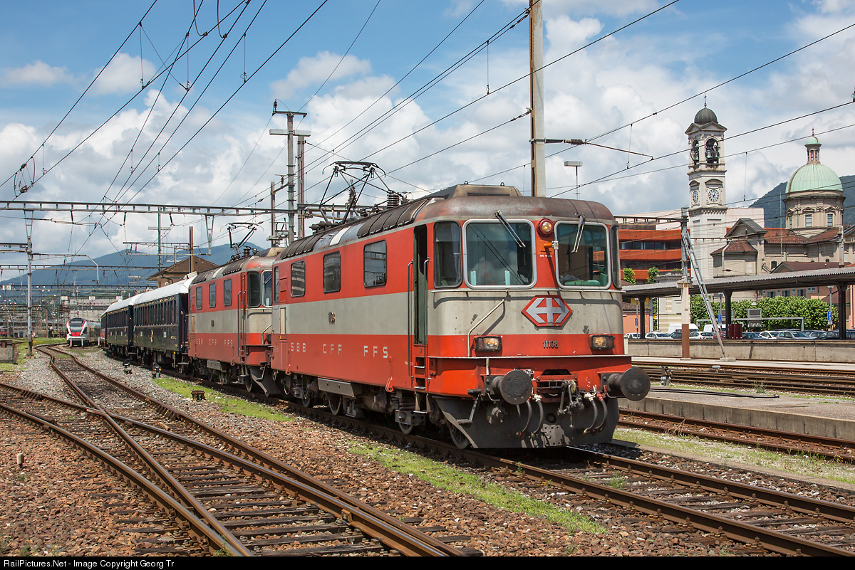 The two lonely Re 4/4 II in "Swiss Express" paint scheme, # 11108 and 11109, are together pulling the 15 car "Venice Simplon-Orient-Express" (VSOE) from Basel via the Gotthard into Chiasso station, border to Italy. Thanks to a short message of a good colleague and a trip across Switzerland this photo was possible in the sunny Ticino, while on the north side of the Alps it was raining.