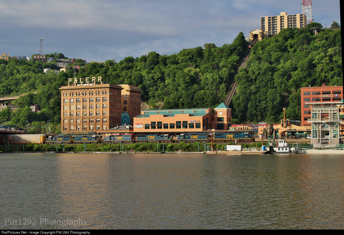 | CSX 7618 leads CSX 8460, 8567. 8469, 2244, 6478 WB past the old Pittsburgh & Lake Erie station in Pittsburgh, Pa |