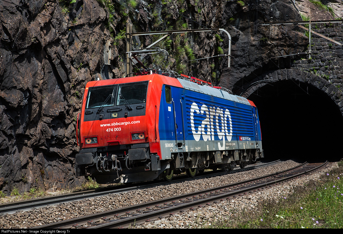 | Four system Re 474 # 003 of the SBB, built by Siemens in 2005 (type ES 64 F4), running light southbound at the Leggistein tunnel portal. |