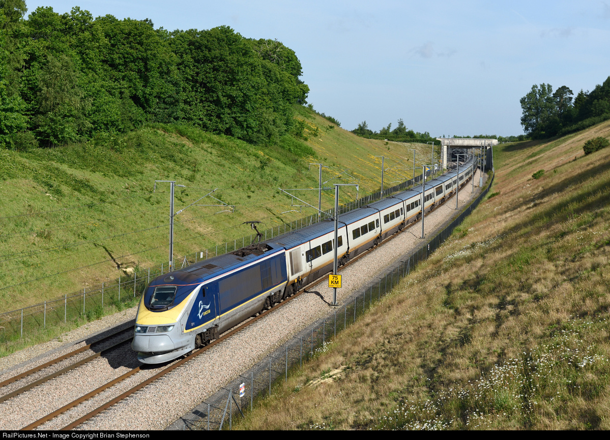 | Repainted Eurostar power car No 3016 (Alias 3211) leads the 07.19 London St.Pancras to Marseille St.Charles. This is a new service that recently commenced running to the south of France and will arrive in Marseilles at 14.46 - a journey time of 6 hours 27 minutes allowing for the one hour difference in time between the UK and France. |