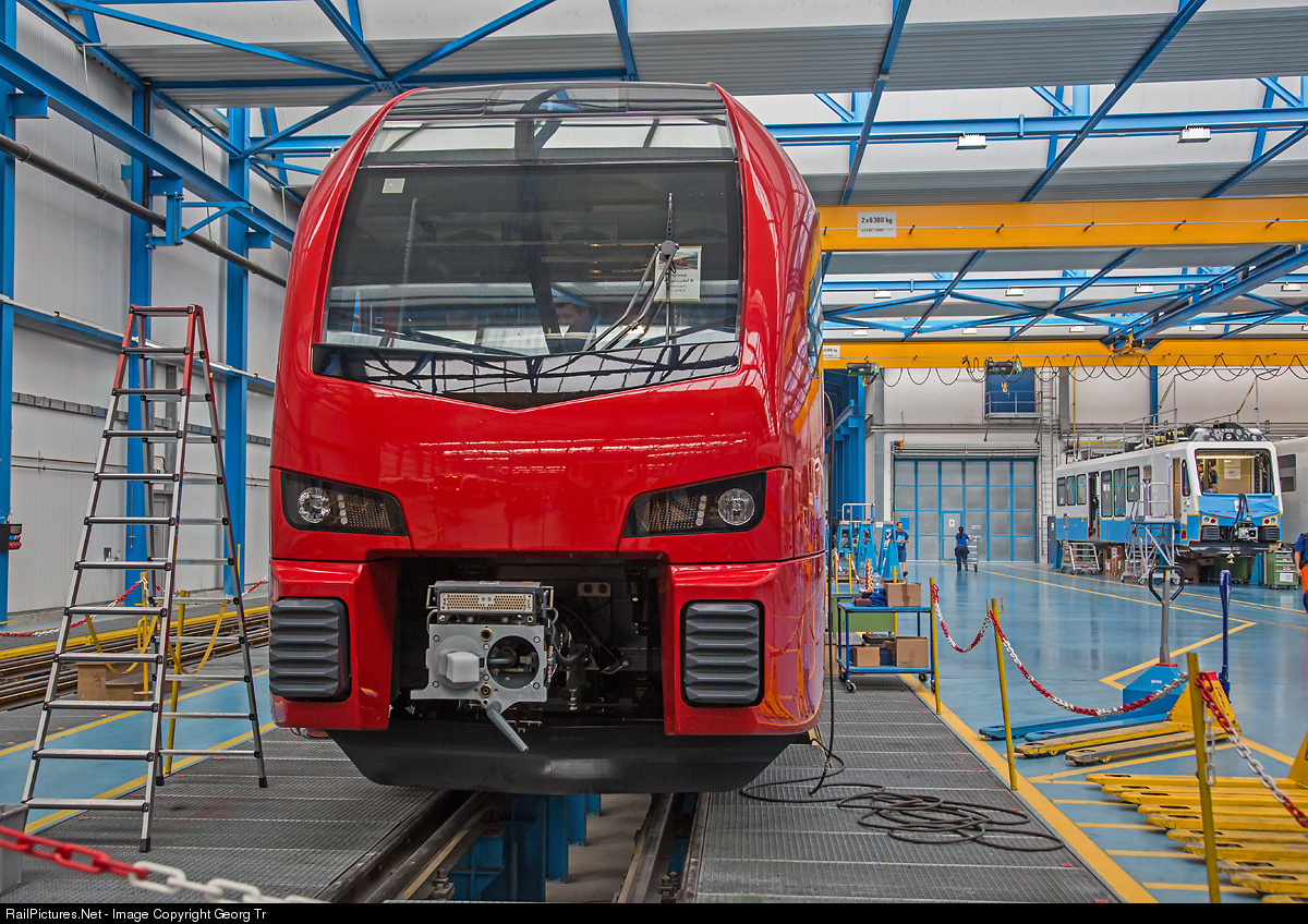 4 car "Flirt 3" trainset 413/417 # 041/042 for the Serbian Railways (Zeleznice Srbije) during assembling in the Bussnang works of Stadler Rail. This is the last of 21 trains to be built. On the right a diesel two car, 950 mm narrow gauge train for the A.R.S.T. in Sardinia/Italy.
