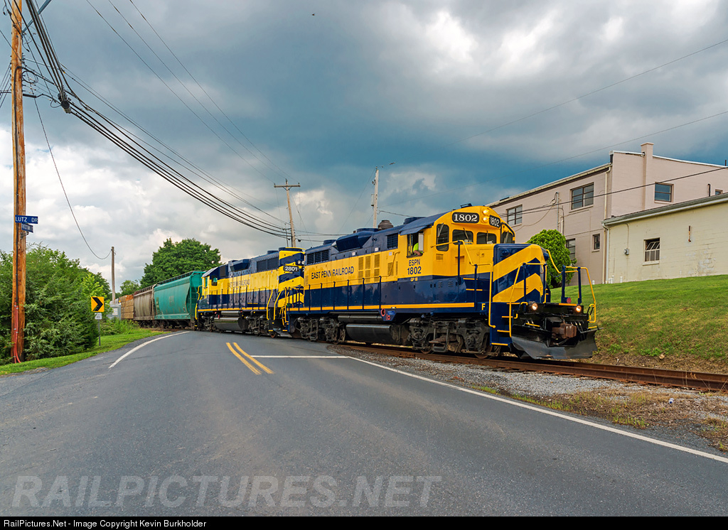 | The East Penn Railroad's Lancaster & Northern Railroad ESPN GP18 #1802 and GP38-3 2801 are with loaded cars from the Norfolk Southern Reading Yard south of Sinking Spring, Pennsylvania, at Fritztown Road as symbol KH03. |