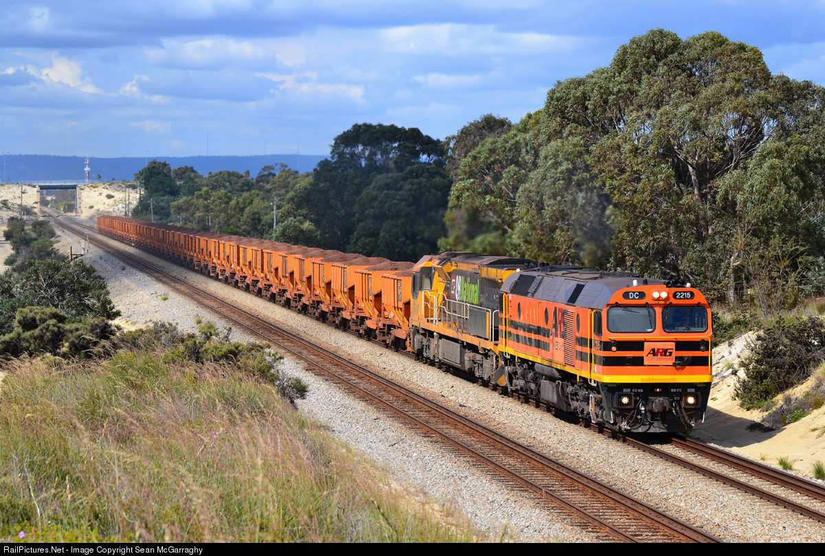 | DC2215 & ACA6009 combine to haul 2034 from Mt Walton, the second portion of a 116-hopper long loaded Polaris iron ore train that was split in half at Forrestfield before continuing on to Kwinana for discharge. |