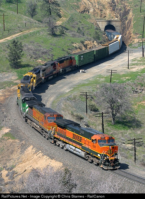 BNSF 1061 leads a southbound freight with another interesting mix of power out of the tunnel at Walong.