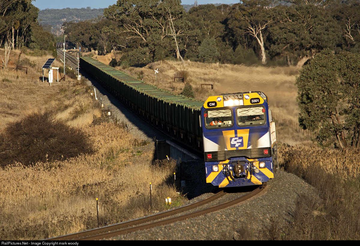 | CM3301-CM3305 work empty ore wagons west as train 4847 and lean into the elevated curve after crossing Wollar Creek. Note rear of east bound coal loads in the loop at wollar shown in the back ground behind ore wagons. |