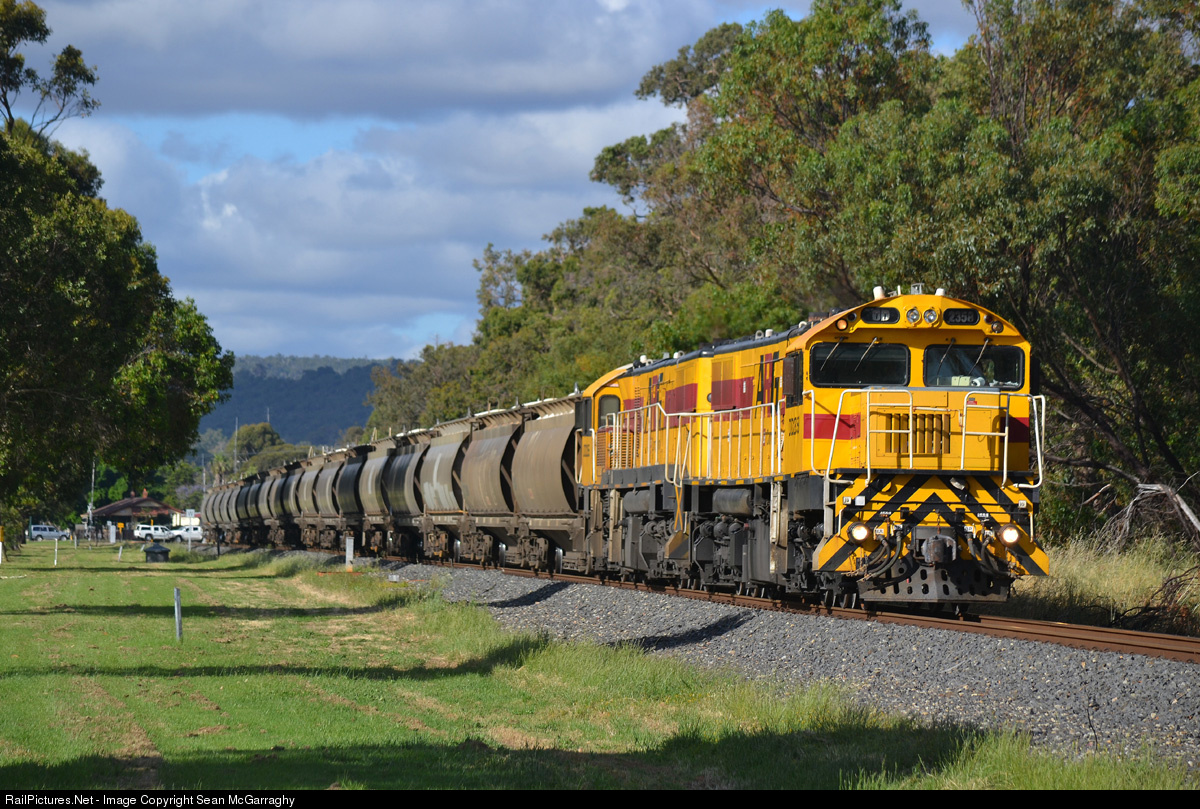| A pair of ex Queensland Rail 2100 class, now reclassed as DD class, are seen here operating for QR National/Aurizon from Yalup Brook to Bunbury. DD2358 (formerly QR's 2117) & DD2355 (formerly QR's 2101) race through Harvey with their loaded alumina train. |