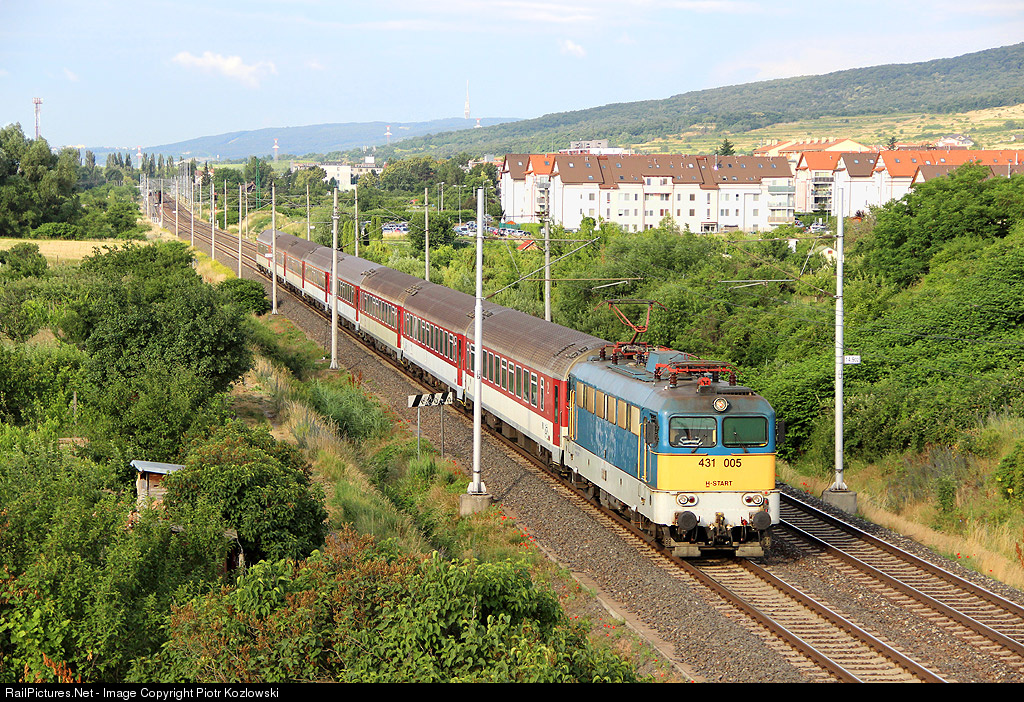 | ex V43 1005 with R 721 "Bojnice" Bratislava hl.st. - Prievidza. In the background Malé Karpaty mountains, near Bratislava, and television tower on the hill Kamzík (433m). The height of structures (194m). |