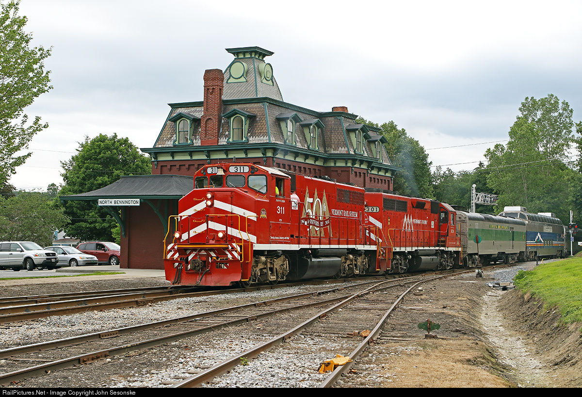 | The second to last excursion of the NRHS Convention passes the station at North Bennington as it returns NB from Hoosick Jct. This train made a roundtrip over the entire B&R Sub from Rutland, VT to Hoosick Jct, NY and return. VTR 301 is the trailing unit on the 10 car train. |