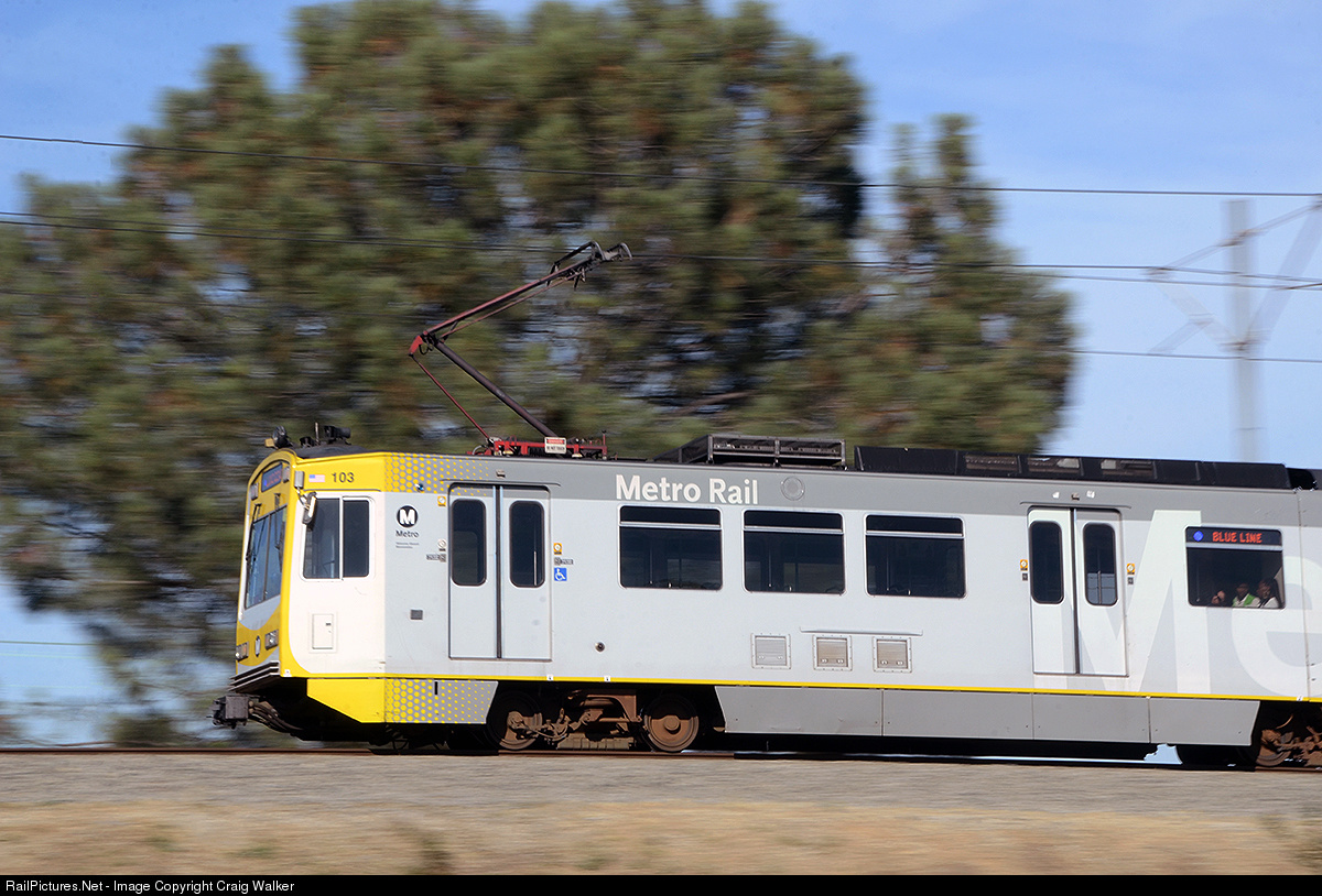 | Los Angeles Metropolitan Transit Agency P865 light rail car 103, seen on the MTA's Los Angeles to Long Beach "Blue Line," wears the agency's newest paint scheme. The car is accelerating out of the Wardlow Station as it speeds commuters toward Long Beach on June 22nd, 2015. |