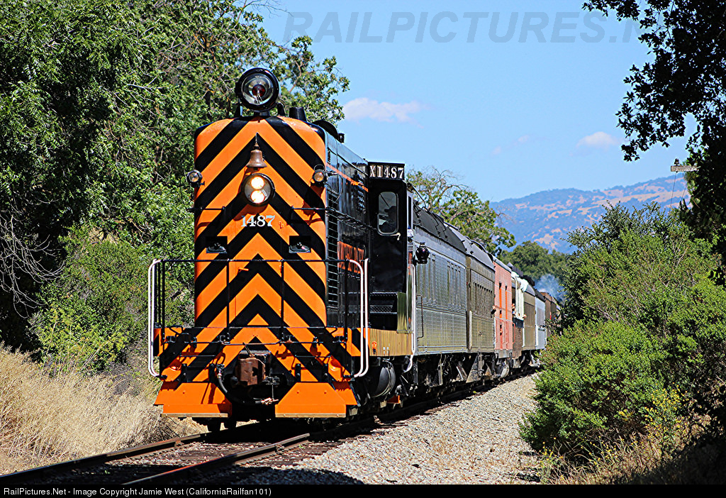 Southern Pacific 1487, a Fairbanks-Morse H-12-44, leads the SP 2472 Memorial Day Special through Farmers Crossing just outside of Sunol on the Niles Canyon Railway.