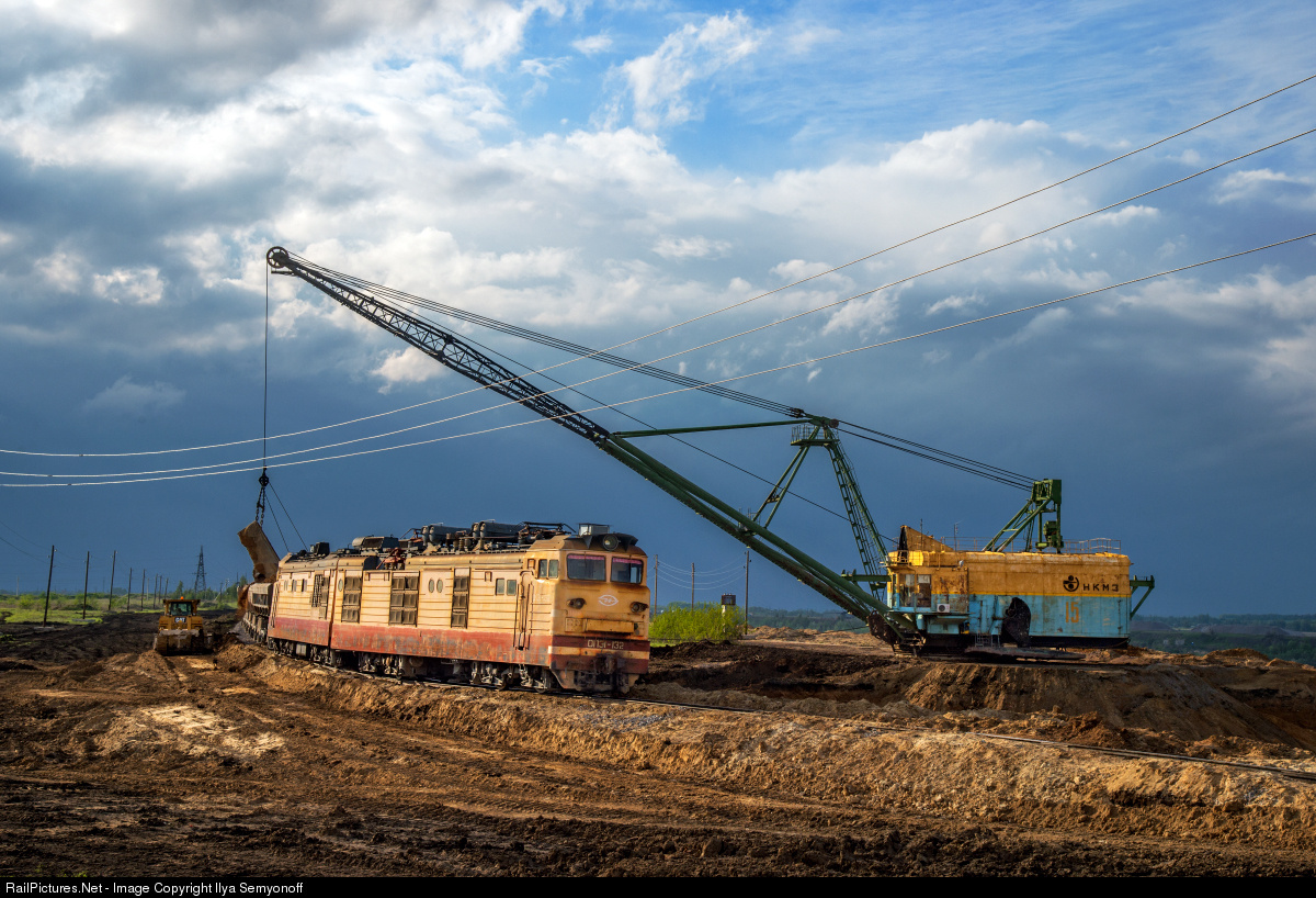 OPE1 traction unit stands on the filling at the quarry of "Pavlovsky GOK". OPE1 is the first Soviet traction unit manufactured by Novocherkassk Electric Locomotive Plant (USSR) between 1970 and 2001 years. It designed for work on open cast mining railways, electrified in the single-phase AC power frequency of 50 Hz at a voltage of 10 kV. It also have an opportunity to work on non-electrified stretch. The equipment of the unit is designed for reliable operation at higher voltage in the contact network to 11.6 kV and lowered to 7.5 kV. OPE1 traction unit consists of AC electric section and section with diesel generator. The action took place at "Pavlovsk Mining and Processing Integrated Works" ("Pavlovsky GOK") - the largest plant for extraction and processing granite in Europe.