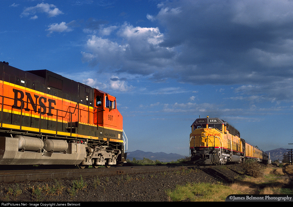 A BNSF Denver to Stockton trackage rights train meets a UP Salt Lake City to Denver inspection special at Geneva-Pipemill on Aug. 13, 1997.