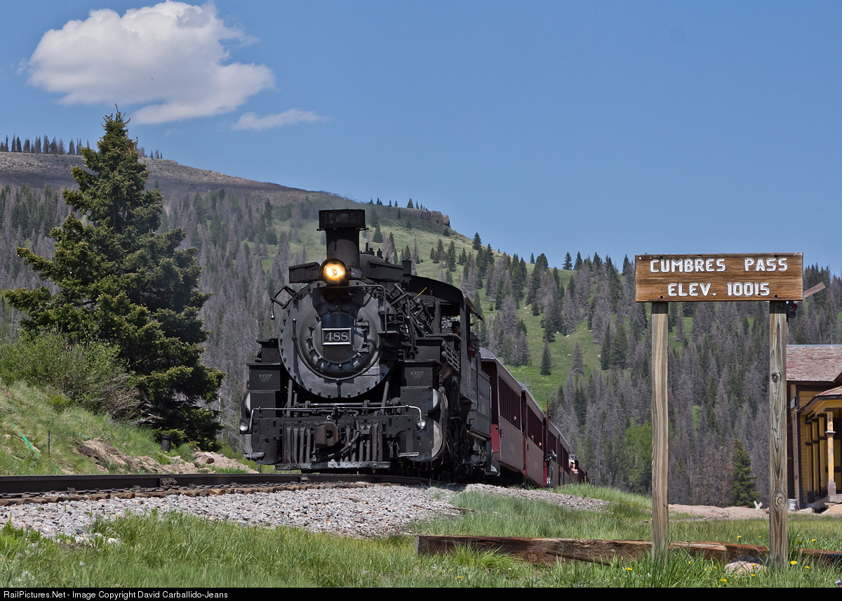 | After stopping for water, Cumbres & Toltec Scenic Railroad's 2-8-2 steam locomotive #488 pulls the westbound Antonito to Chama passenger train over the summit of Cumbres Pass during a beautiful summer day in southern Colorado. |