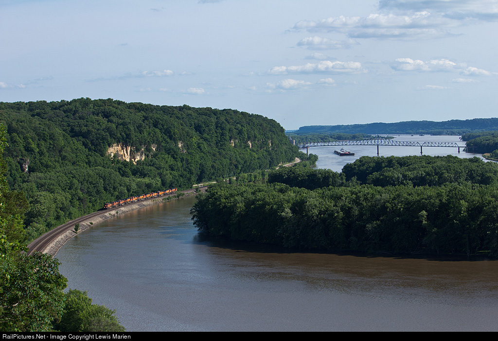 | 11 BNSF units on a light power move out of Cicero Yard in Chicago for Northtown Yard near Minneapolis work their way out of Savanna after a crew change, coasting alongside the shore of the Mississippi River on June 23, 2015. |