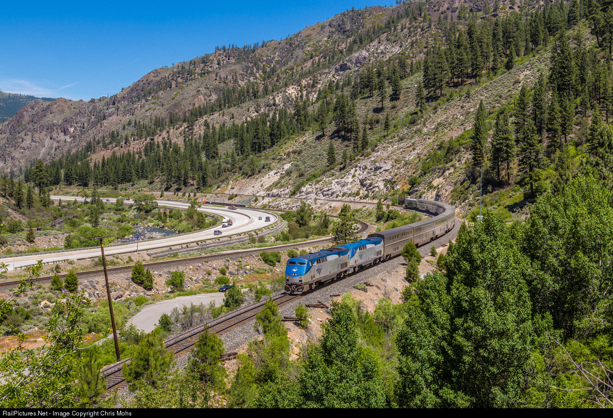 | Climbing up the East side of the Sierra Nevada Mountains through the Truckee River Canyon to Donner Pass, is Amtrak No. 5 the California Zephyr. A good view of the railway can be seen from Interstate 80 along this section. |