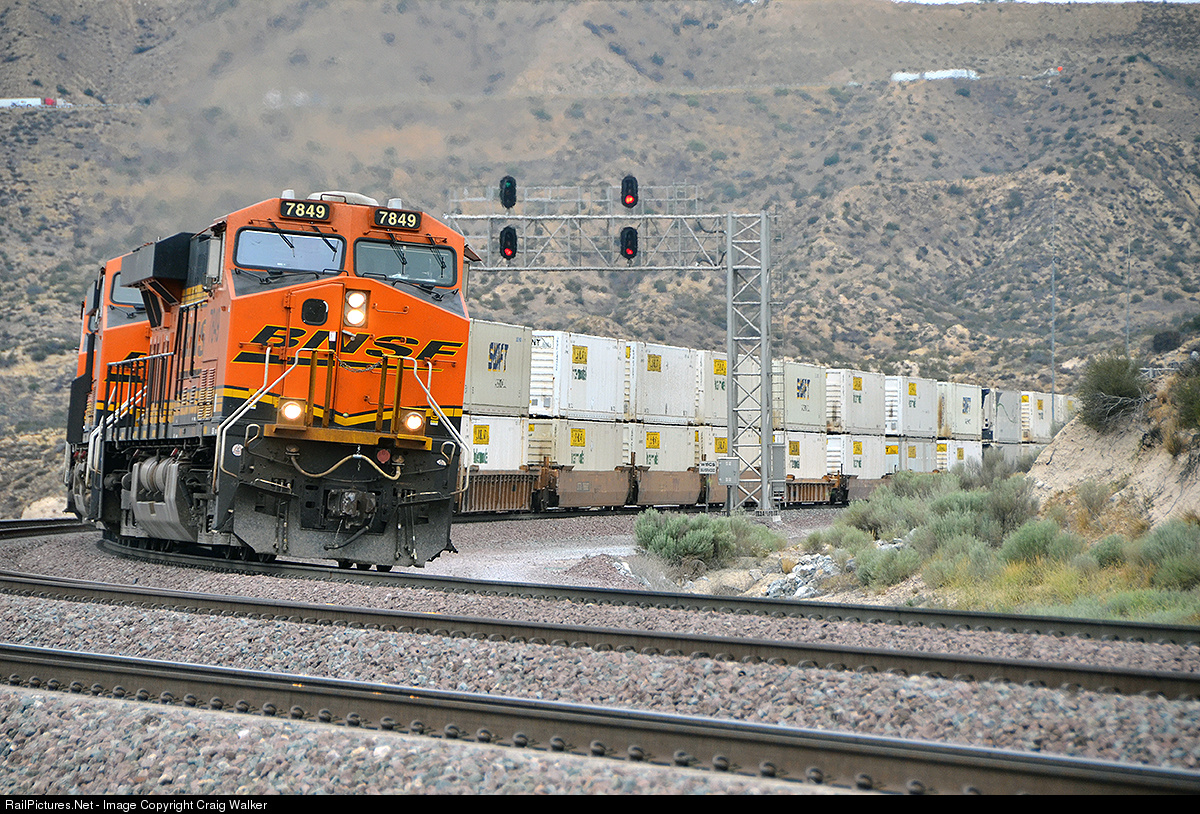 An eastbound BNSF Railway double-stack train, Z-SBDWSP7-26A (Priority UPS-LTL Intermodal; San Bernardino CA to Willow Springs IL), rounds the curve at the east end of Silverwood as it approaches the Summit of Cajon Pass on June 26th, 2015. In just a few seconds, this train will meet a westbound, for which the clear signal on the cantilever in the background is intended.