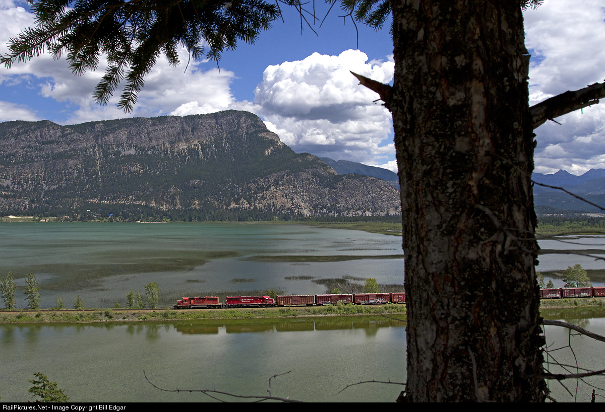 The northbound local from Cranbrook to Golden, BC heads across a fill along Columbia Lake north of Canal Flats, BC. The second unit is a former Soo Line SD60. This train met the southbound local at Skookumchuck, south of Canal Flats, where this train switched the paper mill.