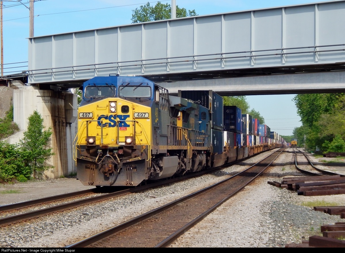 | CSXT 497 speeds west with a stacker through the Miller neighborhood of Gary, IN on track one of the Barr Subdivision. |