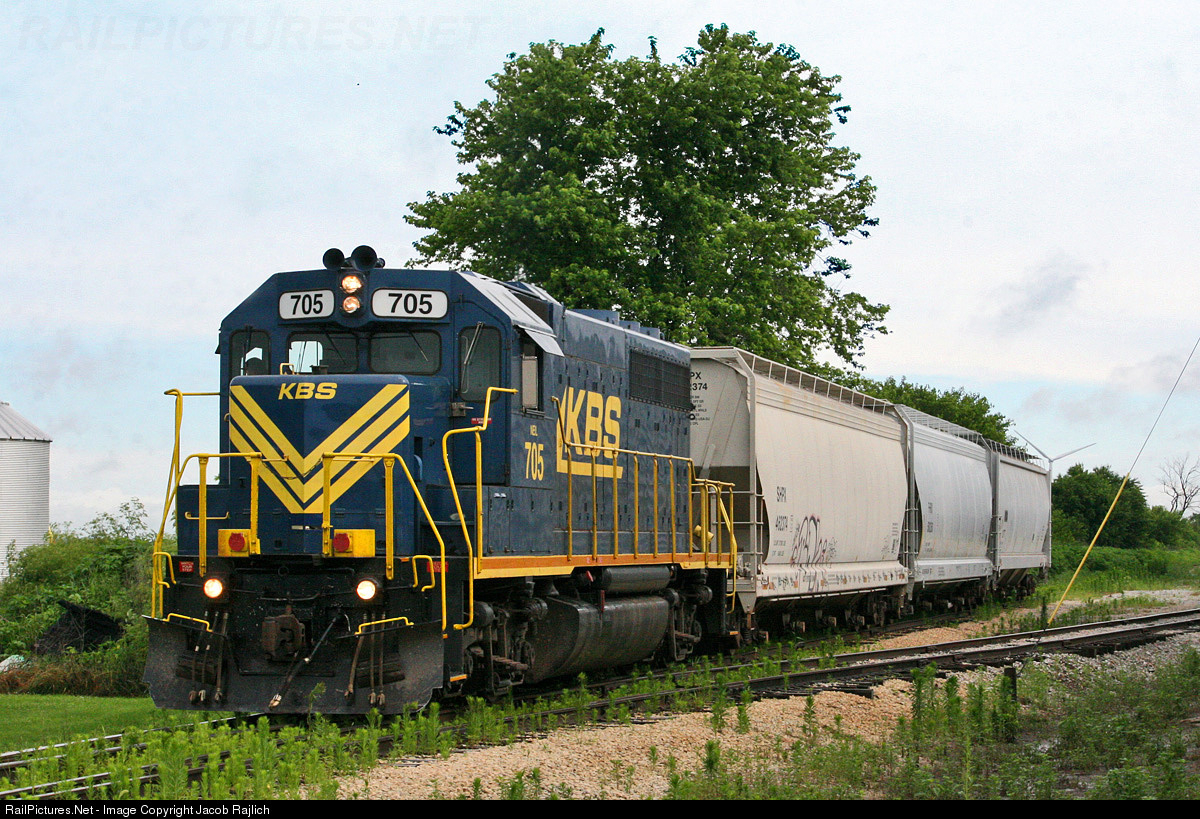 | KBSR GP38-2M 705 waits at the south end of the Darrow elevator with three loaded plastic pellet hoppers, while another crew picks up 47 loaded grain hoppers to attach to the rear of this train. |