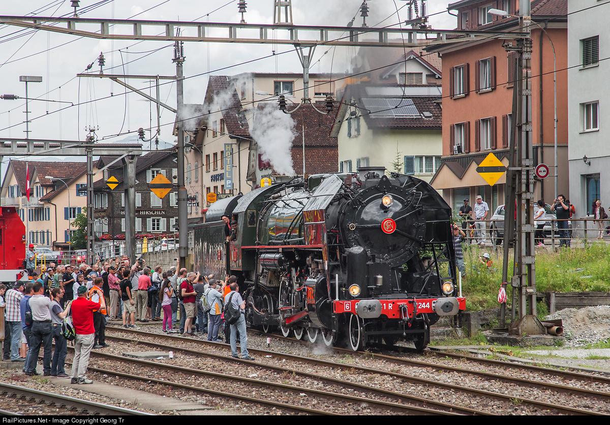 | "Mikado" 141 R 1244 is ready to go back to her train after taking water in Erstfeld, observed by a huge crowd. |