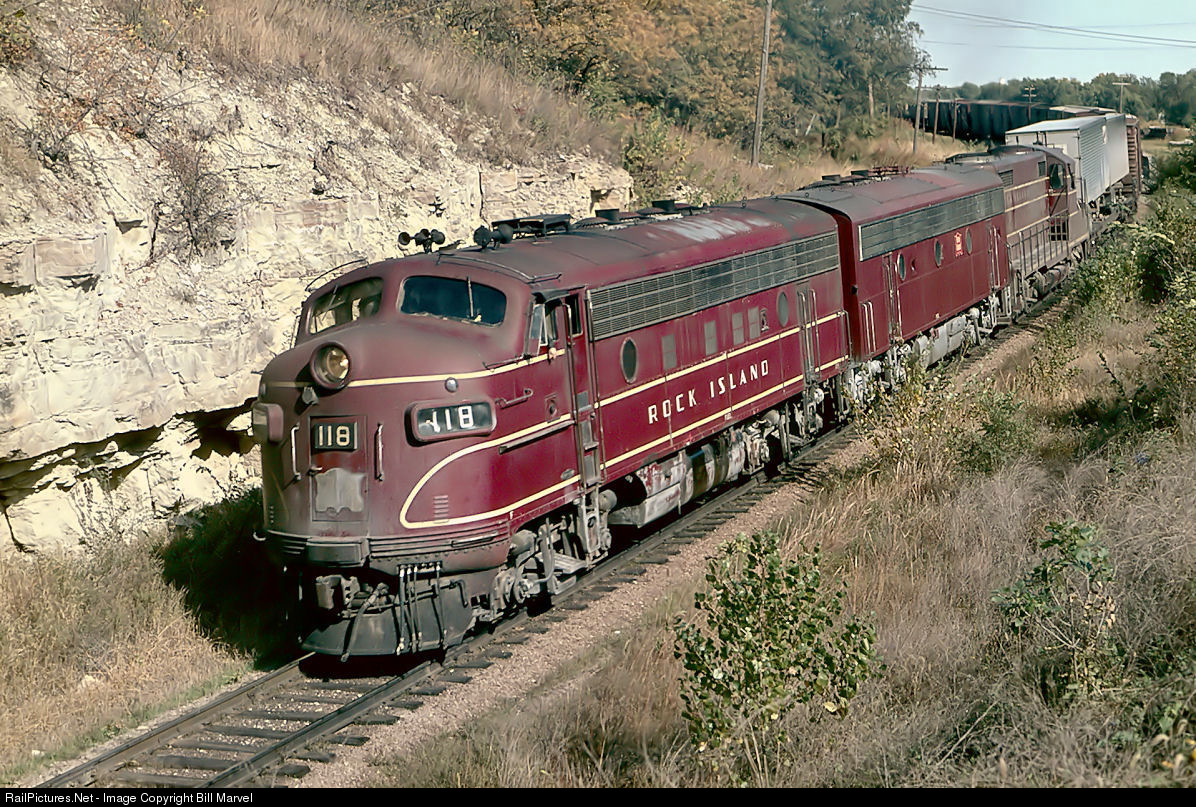 Once upon a time, the HIgh Line connecting the Golden State Route at McFarland and the Omaha-Denver line at Belleville, Kansas, saw four passenger trains (including a Rocket) and a half dozen freights daily. But by October 10, 1965, lucky is the photographer who catches anything moving in daylight on this much overlooked line. This is train 73 out of Kansas City with piggybacks and auto parts for Denver, behind F7A 118, making the curve around Wildcat Bluff in Manhattan, Kansas. The line, officially Subdivision 37, is unsignaled, track speed is 40 mph, and the rails will be taken up four years after Rock Island’s 1980 bankruptcy. Today, the view here is all suburban sprawl.