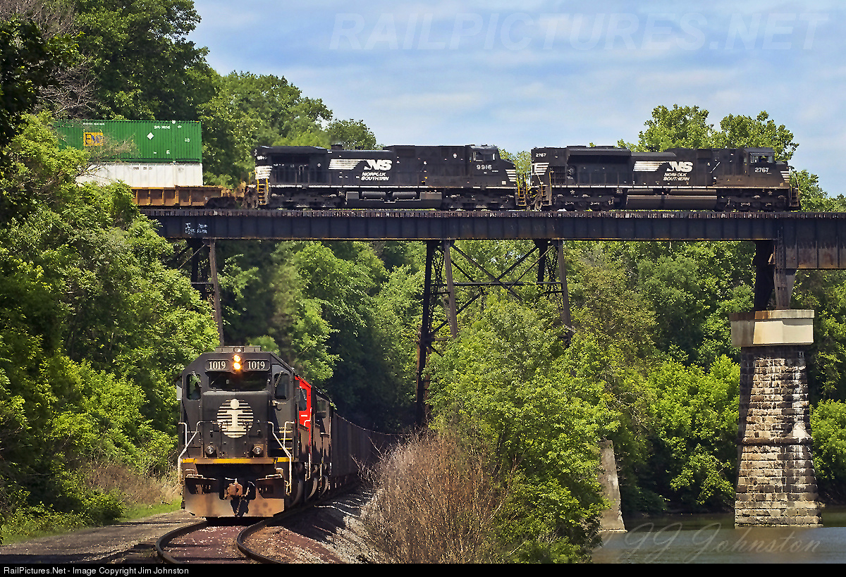 IC 1019 departs the ore docks on the CN Bessemer Sub southbound as NS 22K stack train passes over head on the former NKP.