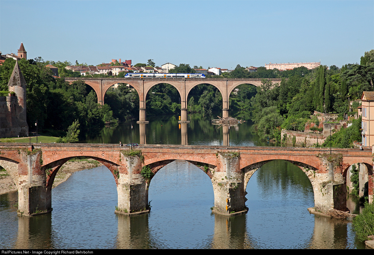 | A TER (regional train) Rodez - Toulouse is crossing the bridge over the river Tarn. |