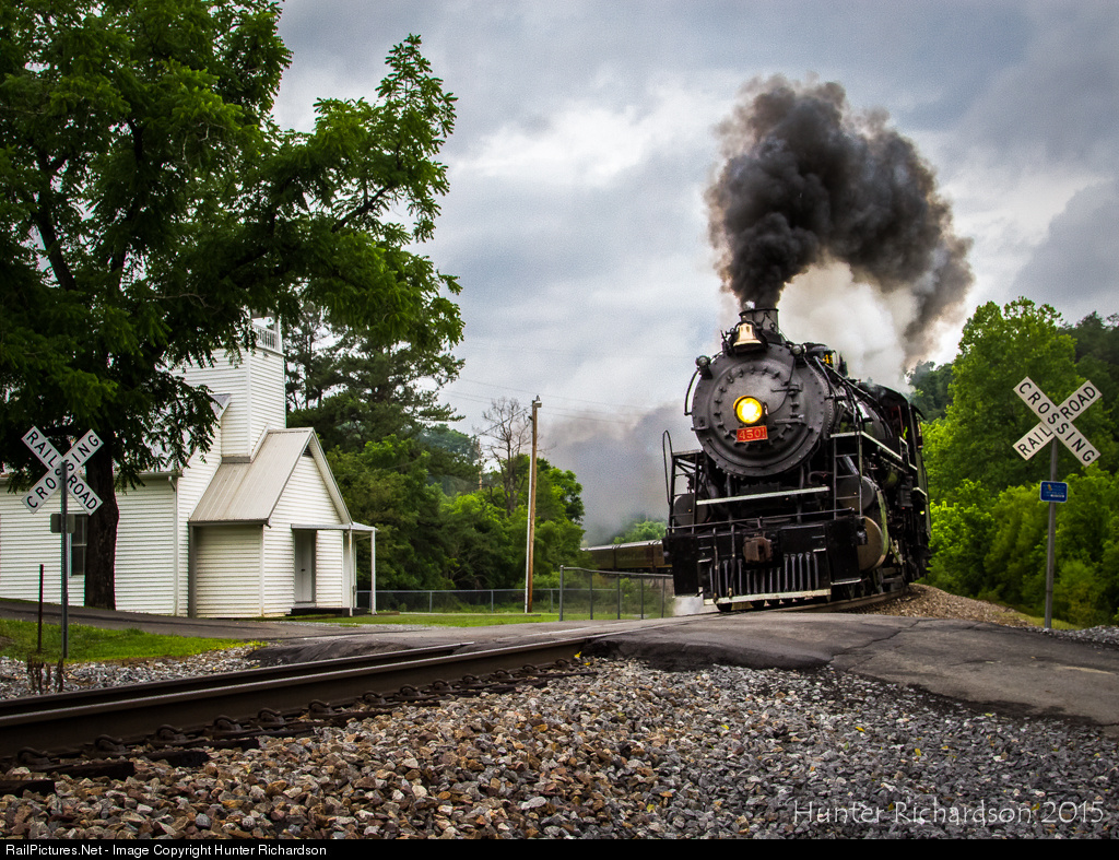| Rounding a sweeping curve and dropping downgrade into the Watauga community, Southern 4501 passes a little white church on it's way to a passenger stop in Johnson City, Tennessee. |