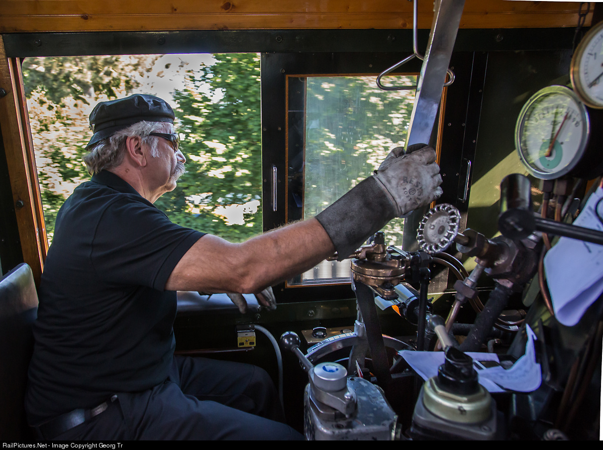 Engineer Sigi at the throttle of "Mikado" 141 R 1244, a canadian built, former french railways 2-8-2 with about 3000 HP and 100 km/h max velocity.