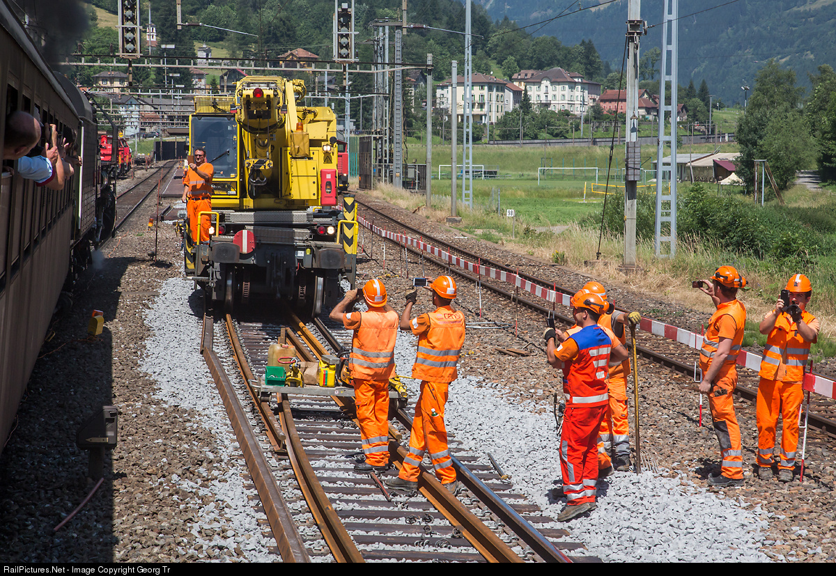 All workers stopped track rebuilding to make videos with their smartphones of the steamtrain which is thundering up the Gotthard south ramp in Rodi-Fiesso station.