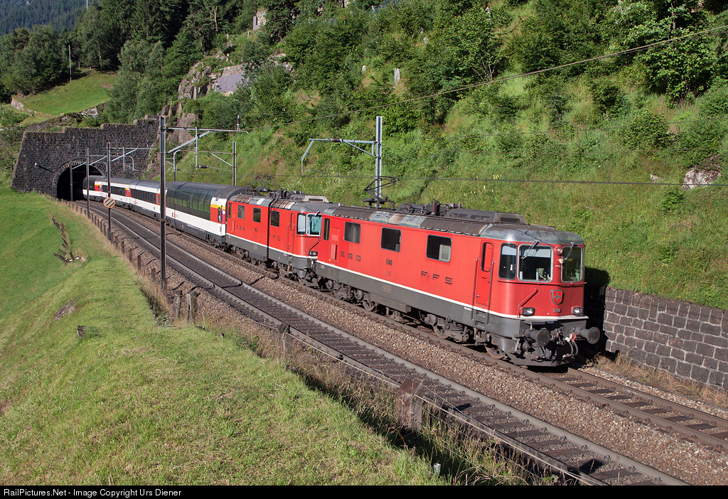 | Interregio train 2414 from Chiasso to Zürich Mainstation with the leading Re 4/4 II 11140 and the sister locomotive 11132. |