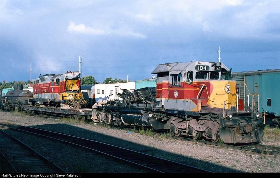 Beavers caused this! On a fateful night in September 1993, Algoma Central’s ore train with SD40 184 and GP7 102 was descending a heavy grade when it discovered the right of way just ahead washed away. Investigation determined a beaver dam over a mile away and higher in the mountains contained a large body of water and following recent downpours the dam suddenly gave way that night. The crewmen survived and recovered. Photo at AC shops at Steelton, Ont. Sept. 29, 1993.