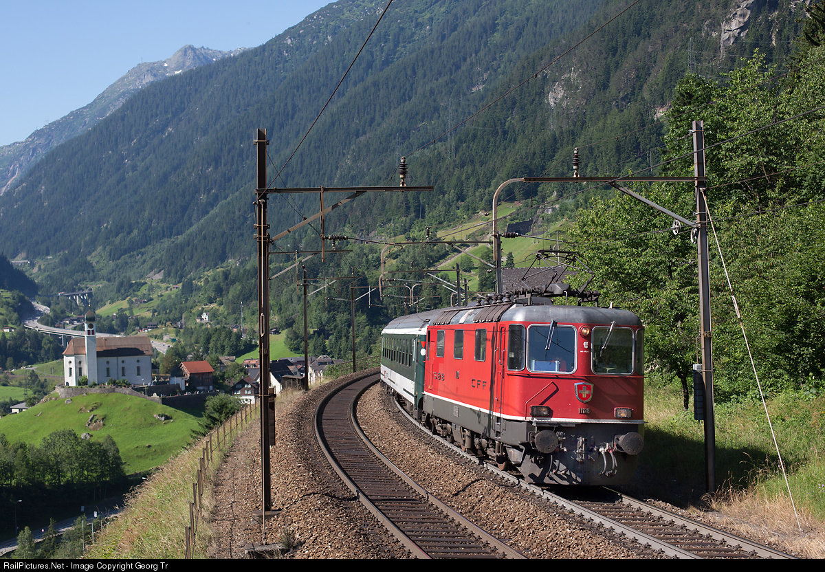 | Re 4/4 II # 11128 from the first series is pulling Interregio 2313 Basel - Locarno on the middle level of the loops of Wassen. |