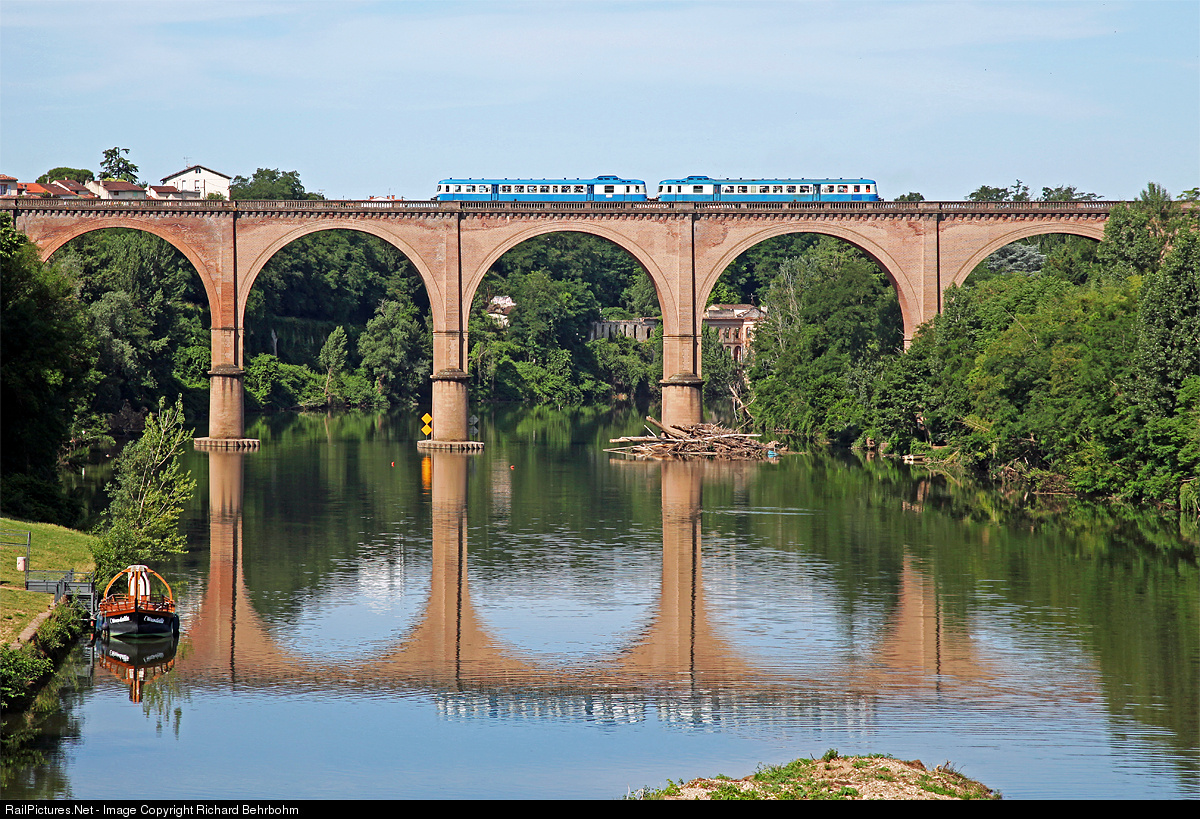 | The historic railcars X 2914 and X 2819, built by Renault in 1962 and 1958, are crossing the bridge over the river Tarn. |