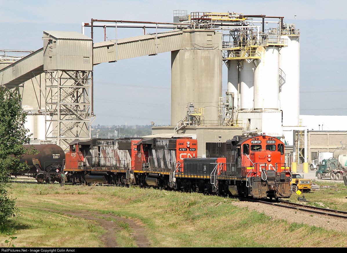 | Switching cars into the Lafarge Plant at Clover Bar are GP9RM CN 7213, GP9 slug #240, and GP38-2(W)'s CN 4781 and 4767. |